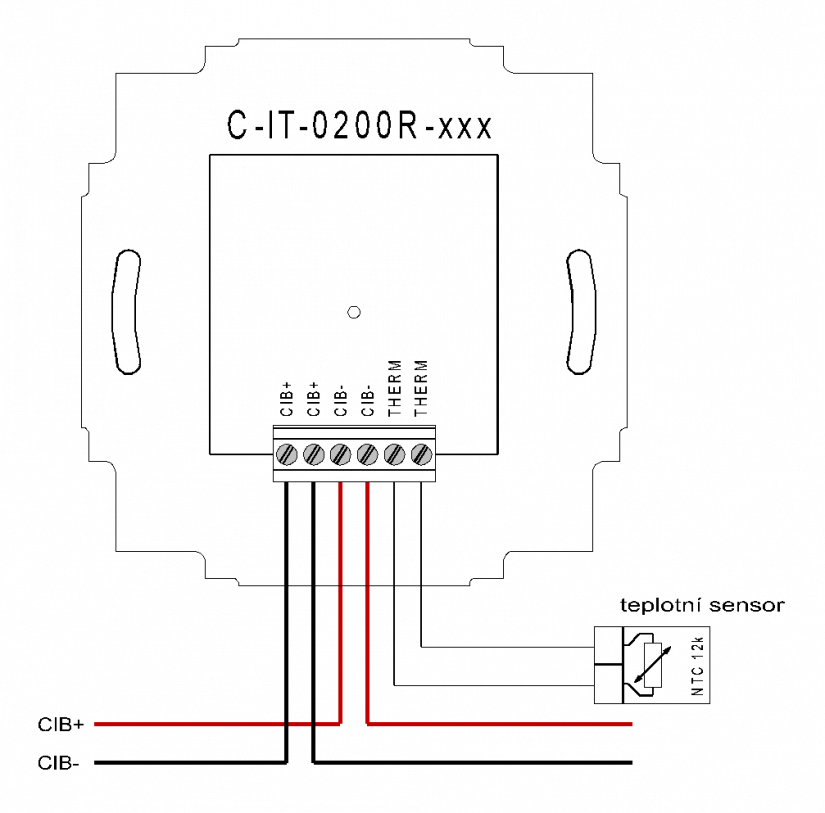- Externí čidlo teploty musí být NTC 12k, délka přívodního kabelu může být až desítky metrů – typické použití podlahové čidlo, použitý kabel např. SYKFY a podobný kabel alespoň 1x2 vodiče průměru min. 0,5 mm.