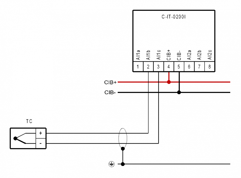 Obr. 1 Příklad zapojení modulu C-IT-0200I, připojení termočlánkovým snímače teploty