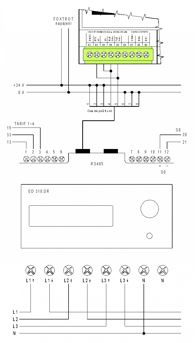 Následující obrázek (na další stránce) znázorňuje připojení elektroměru ED 310.DR ke komunikačnímu kanálu CH2 základního modulu Foxtrot. V další části kapitoly jsou uvedeny podrobné informace o vlastním elektroměru.