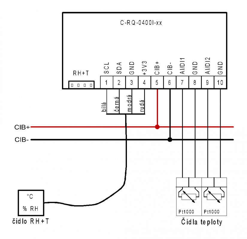Kombinované čidlo teploty a vlhkosti je do modulu přivedeno kabelem, který je připojen na svorkovnici modulu, barvy vodičů jsou uvedeny ve schématu.