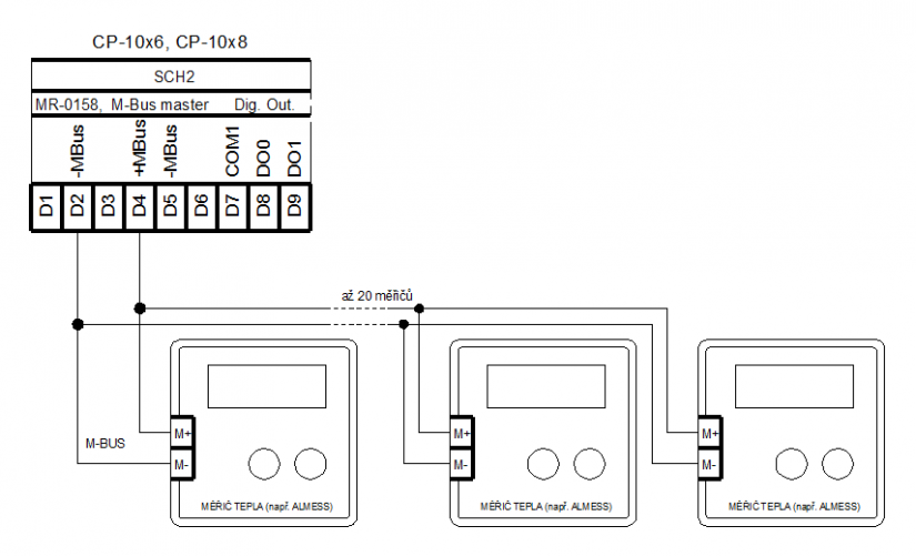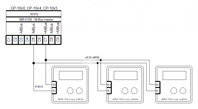 Obr. 1 Připojení měřičů M-Bus k rozhraní CH2 (MR-0158) modulu CP-10x6, CP-10x8