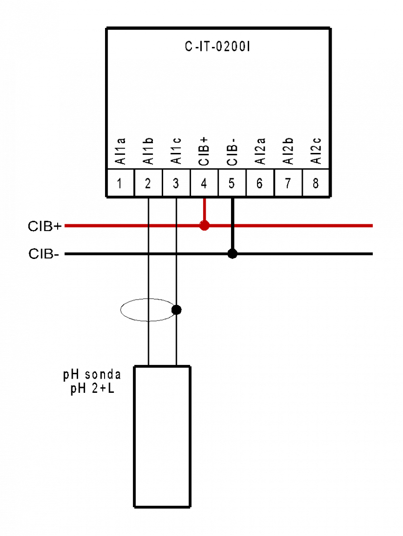 Následující obrázek ukazuje připojení sondy pH 2+L k modulu C-IT-0200I
