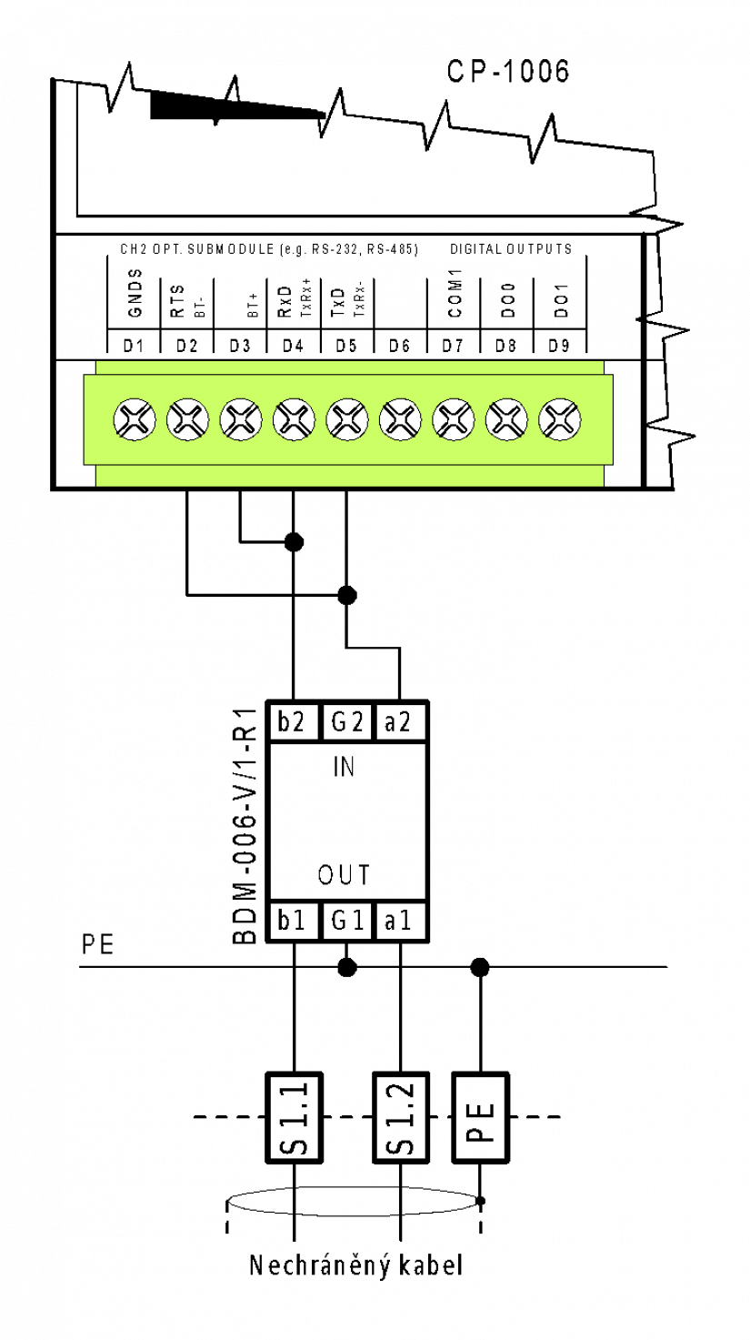Obr. 2 Příklad zapojení přepěťové ochrany komunikačního rozhraní RS-485 u CP-1006