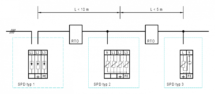 Pro správnou funkci SPD v instalaci musí být zabezpečena správná vzájemná koordinace – tj. zajištění min. požadované impedance mezi jednotlivými stupni SPD. Toho dosáhneme buď minimálně danou délkou kabelu (obr. 1), při nedodržení min. délky vložením rázové oddělovací tlumivky RTO (obr. 2). Správný výběr oddělovacích tlumivek je vhodné řešit dle dokumentace výrobce SPD.