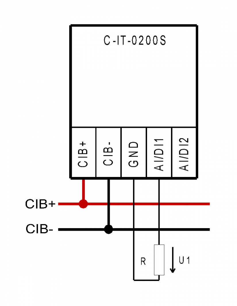 V zapojení je použit příklad modulu C-IT-0200S. Shodné zapojení platí pro všechny moduly, které mají vstupy DI spínané proti zemní svorce GND, tj. neplatí pro DI modulů C(R)-HM-1113M a C(R)-HM-1121M.