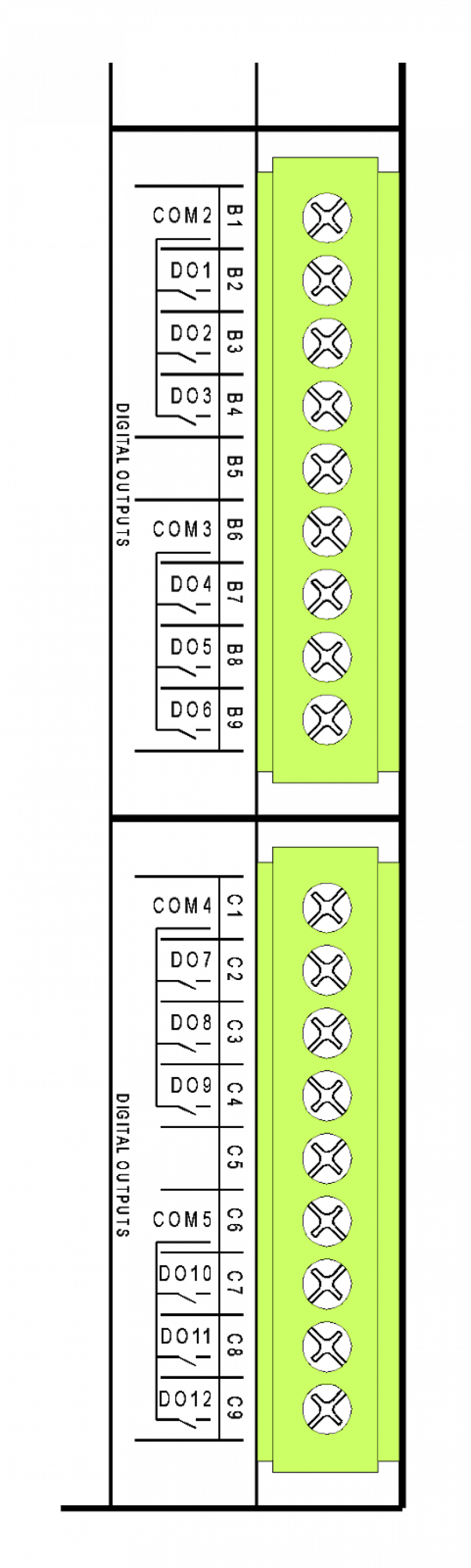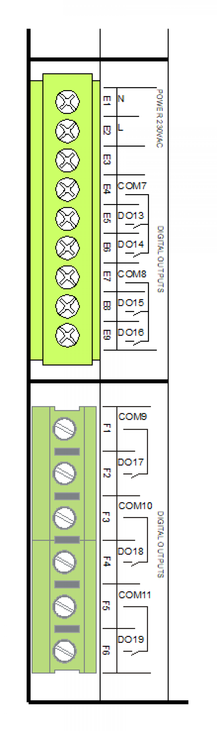 Kromě skupin výstupů DO13, DO14 a DO15, DO16 (které jsou odděleny pouze pracovní izolací) můžeme jednotlivými skupinami výstupů libovolně spínat obvody nízkého napětí (i různé fáze) a obvody malého bezpečného napětí. Pouze skupiny DO13, DO14 a DO15, DO16 musí být napájeny z jedné fáze, a musí být obě použity buď na obvody malého bezpečného napětí, nebo NN ze stejné fáze.