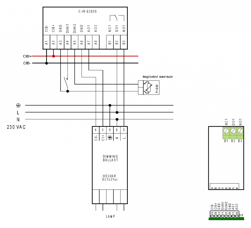 Modul C-IR-0203S je určen pro připojení dvou snímačů teploty nebo binárních signálů, ovládání silovým kontaktem relé a je osazen dvěma analogovými výstupy přímo na elektroinstalační sběrnici CIB.