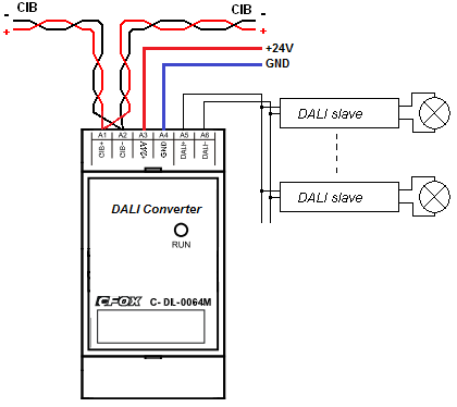 Modul pro svoji funkci vždy vyžaduje externí napájení 24 VDC (pouze z externího zdroje jsou napájeny komunikační část i obvody DALI rozhraní).