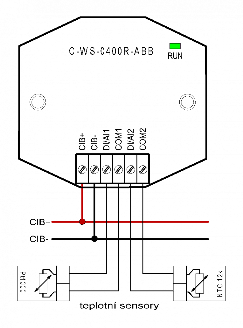 Připojení sběrnice CIB je na svorkovnici na zadní straně modulu, kde jsou vyvedeny i 2 univerzální AI/DI vstupy. Každý z univerzálních vstupů lze samostatně použít buď ve funkci binárního bezpotenciálového vstupu, nebo analogového vstupu pro připojení odporového teplotního čidla.