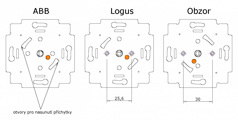 - Pravý obrázek má zvýrazněné otvory pro šrouby krytů v designech Obzor.