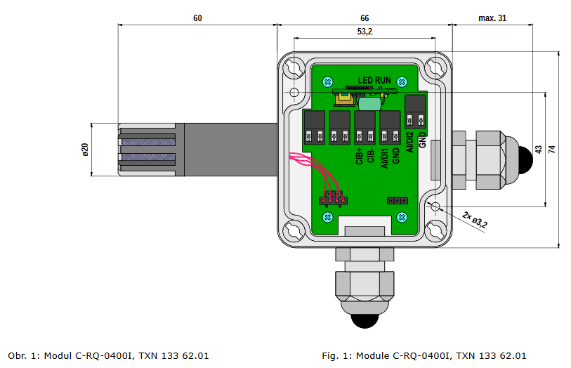 Obr. 3 Mechanické provedení modulu C-RQ-0400I-xx, umístění svorek, průchodek pro kabely