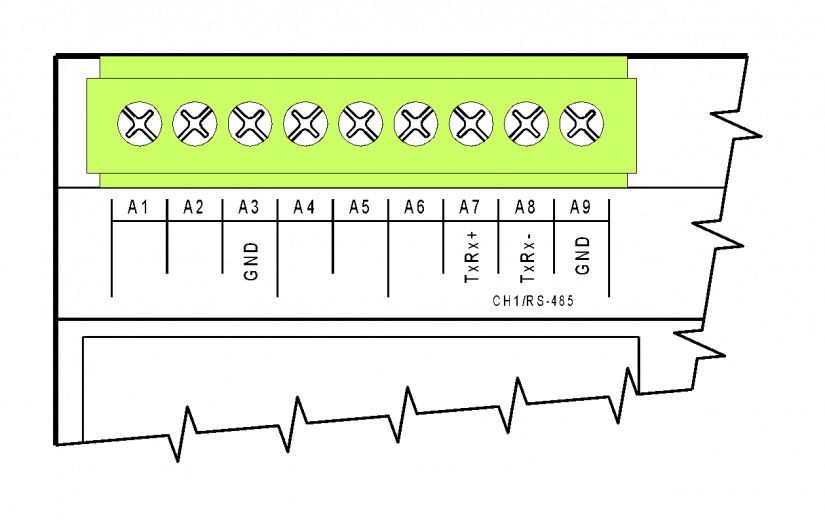 Sériové rozhraní základního modulu CH1 modulu CP-1003 a CP-1091 je osazeno pevně rozhraním RS-485 bez galvanického oddělení (tj. signály rozhraní jsou galvanicky spojeny s napájením modulu, rozhraním CIB, TCL2 a analogovými vstupy na základním modulu CP-1003 a CP-1091). Pohled na svorkovnici (při standardní pracovní poloze PLC na panelu rozvaděče) je na obr. 1.