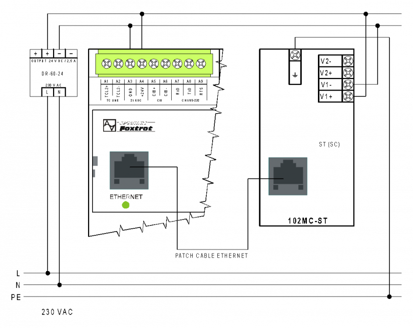 Konvertor je napájen ze 24 VDC (odběr max. 140 mA, lze jej napájet ze společného zdroje se systémem Foxtrot), je vybaven jedním portem 100BaseTX (standardní ETHERNET RJ-45, pro připojení do ETHERNET konektoru systému Foxtrot) a jedním portem 100BaseFX, ST nebo SC Duplex port - pro připojení do optické sítě.