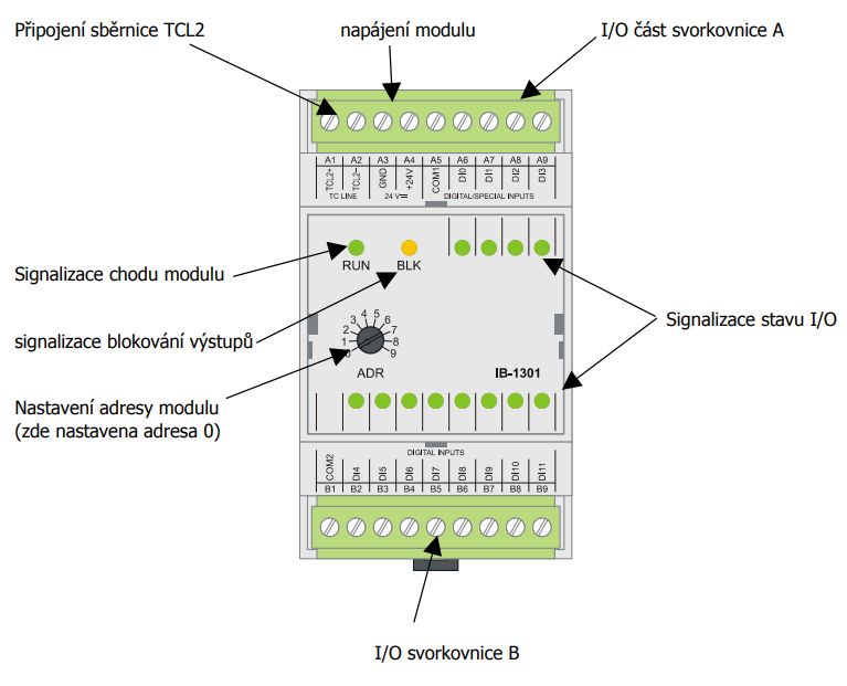 Obr. 1 Připojení sběrnice TCL2 a napájení modulu I/O část svorkovnice A