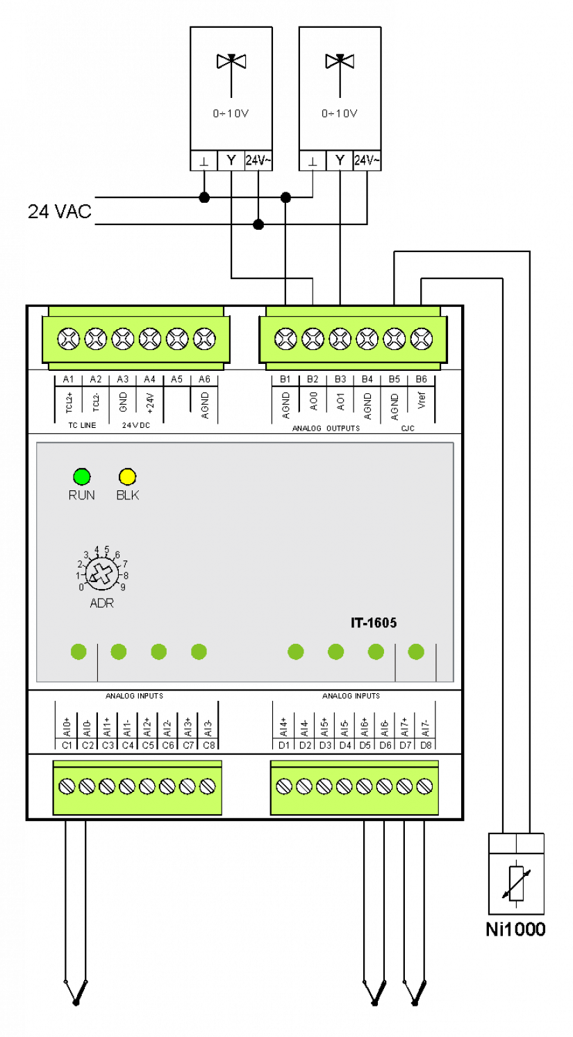 Rozšiřovací modul IT-1605 obsahuje 8 analogovách diferenciálních vstupů a 2 analogové výstupy se společnou svorkou. Vstupy jsou univerzální, nezávisle konfigurovatelné jako napěťové pro malé hodnoty nebo měření termočlánků, Rozlišení je 16 bitů, modul zabezpečuje zpracování naměřené hodnoty, převod na inženýrské jednotky, apod. Analogové výstupy jsou s rozlišením 10 bit, napěťové -10 V až +10 V. Analogové vstupy a výstupy jsou galvanicky oddělené od vstupního napětí a komunikace TCL2, a stav každého vstupu je signalizován na panelu modulu. Modul je osazen vyjímatelnými šroubovými konektory.