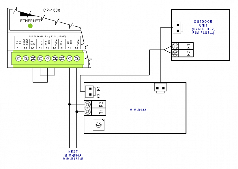 Obr. 2 Příklad připojení komunikačního rozhraní MIM-B13A (SAMSUNG) k CP-1000
