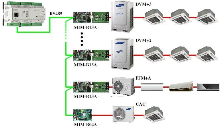Pro připojení klimatizačních jednotek SAMSUNG (řady DVM, CAC, FJM...) využijeme komunikační rozhraní MIM-B04A, MIM-B13A/B osazené do venkovních jednotek klimatizačních zařízení, které připojíme na komunikační kanál CH2 (CH3, CH4) základního modulu FOXTROT. Na jedno komunikační rozhraní (RS-485) můžeme připojit až 16 venkovních jednotek s celkem připojenými 200 vnitřními klimatizačními jednotkami. Komunikační převodníky je nutno správně naadresovat a připojit (viz obr), další nastavení není potřeba. Předpokladem je správné propojení venkovních a vnitřních klimatizačních jednotek dle specifikace výrobce.