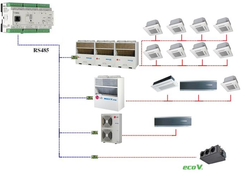 Pro připojení klimatizačních jednotek LG (řady Multi V, Multi M, Multi F, Single A, RAC, eco V...) využijeme komunikační rozhraní PI485 (varianty PMNFP14A0, PMNFP14A1, PHNFP14A0 a PSNFP14A0, protokol LGAP) osazené do venkovních nebo vnitřních jednotek klimatizačních zařízení, které připojíme na komunikační kanál CH2 (CH3, CH4) základního modulu FOXTROT. Na jedno komunikační rozhraní (RS-485) můžeme připojit až 256 vnitřních jednotkek (16 skupin po 16-ti vnitřních jednotkách). Komunikační převodníky je nutno správně naadresovat a připojit (viz obr), další nastavení není potřeba. Předpokladem je správné zapojení klimatizačních jednotek dle specifikace výrobce.