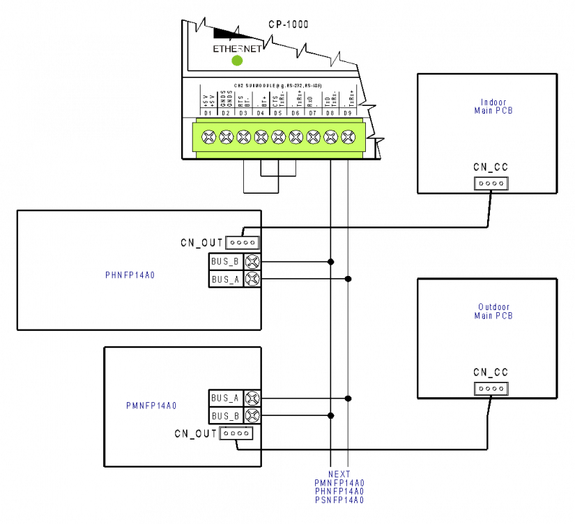 - Propojovací kabel rozhraní RS-485 mezi CP-1000 a moduly rozhraní PI485 jednotek LG je standardní kabel pro RS-485, stíněný kroucený pár, min. průměr 0,35 mm.
