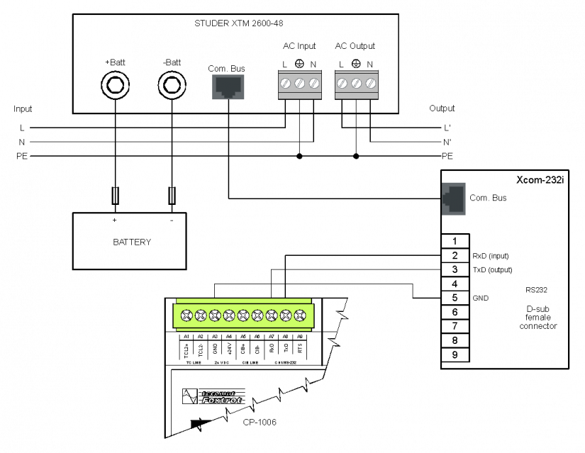 Střídač se připojuje k systému Foxtrot rozhraním RS-232 prostřednictvím komunikačního modulu Xcom-232i, který je se střídačem propojen rozhraním Com.Bus (odpovídá sběrnici CAN). Ke komunikačnímu modulu lze připojit více střídačů, takže je možno takto realizovat např. třífázové sestavy, paralelně řazené střídače apod.