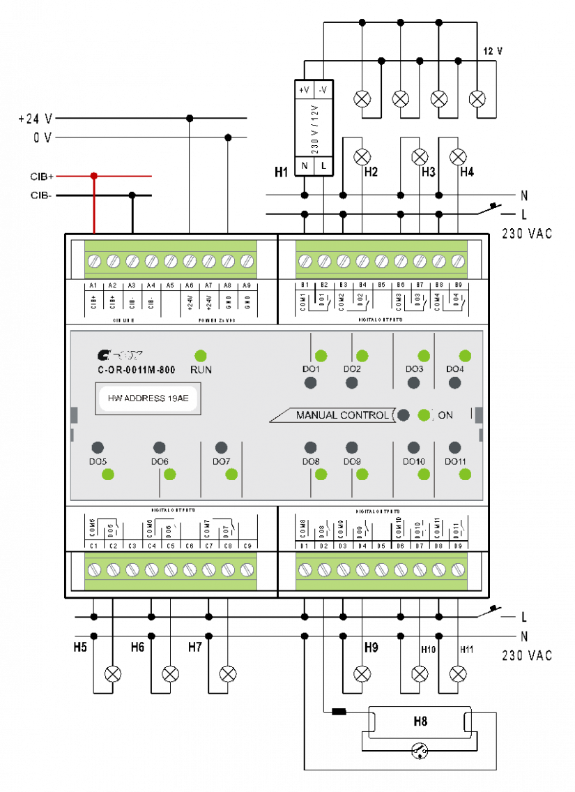 Nejvíce univerzálním modulem pro spínání světelných okruhů je C-OR-0011M-800. Tento modul je osazen 11 reléovými výstupy se spínacím kontaktem 16 A, který je vybaven wolframovým předkontaktem s max. spínacím proudem 800 A po dobu 200 μs. Každý kontakt je vyveden samostatně, což umožňuje libovolné rozdělení do jištěných skupin světelných okruhů. Výstupy můžeme zároveň použít pro ovládání zásuvkových okruhů a v podstatě libovolných dalších zátěží, pro které vyhovují kontakty relé svými parametry.