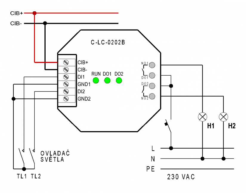 Pro ovládání světel 230VAC máme k dispozici specializovaný modul C-LC-0202B, určený pro ovládání dvou světel a umístění do instalační krabice poblíž světelných zdrojů.