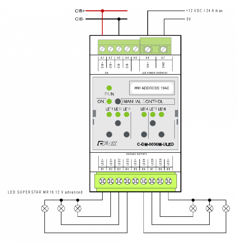 - Modul C-DM-0006M-ULED není vybaven zkratovou ochranou výstupů!