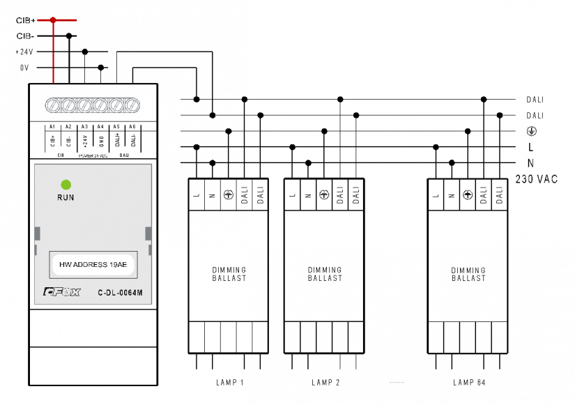 Modul C-DL-0064M je převodník protokolů CIB – DALI. Je určen pro připojení osvětlovacích zařízení s protokolem DALI podle specifikace: NEMA Standards Publication 243-2004.