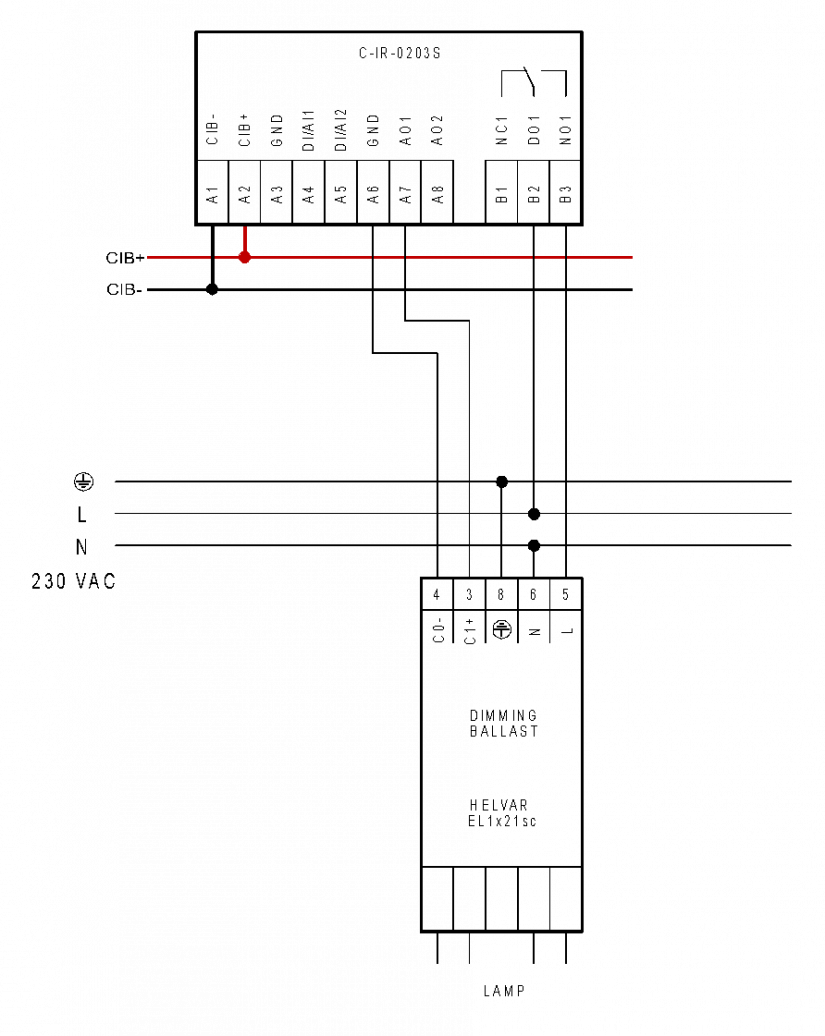 Obr. 1 Příklad zapojení – stmívání zářivkových předřadníků 1÷10V modulem C-IR-0203S
