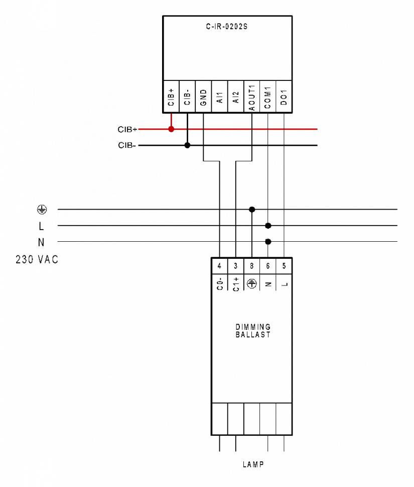 Obr.1 Příklad zapojení – stmívání zářivkových předřadníků 1÷10V modulem C-IR-0202S