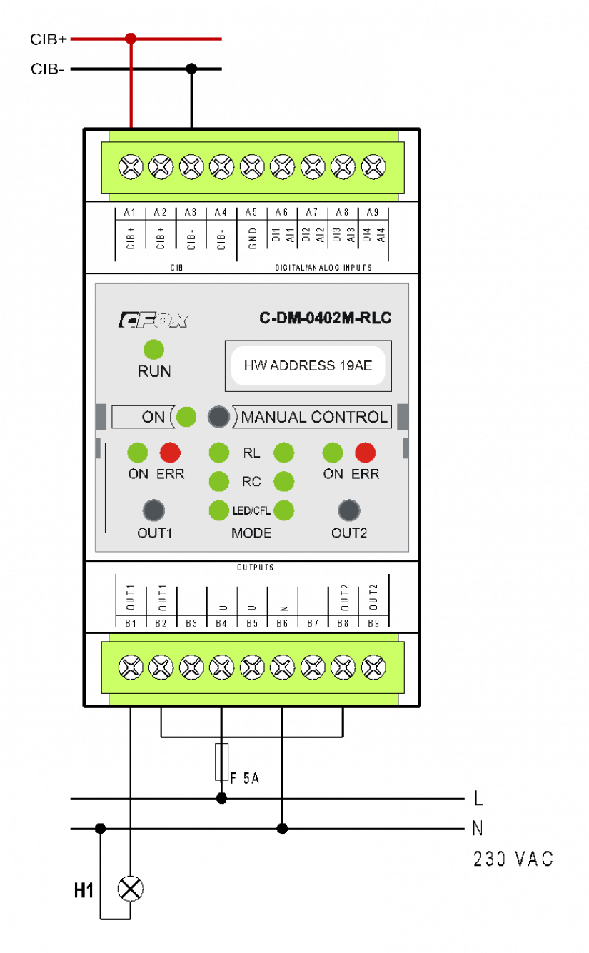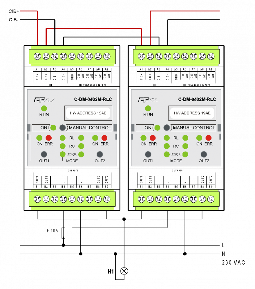 - Pro stmívaný výkon 1 kW (zátěž H1 v příkladu) lze spojit dle příkladu libovolné dva kanály stmívačů, které musí být na stejné větvi CIB – tj. dva kanály jednoho modulu (dle obrázku), nebo dva kanály dvou různých modulů (např. z důvodu rozložení výkonu a tím i oteplení).