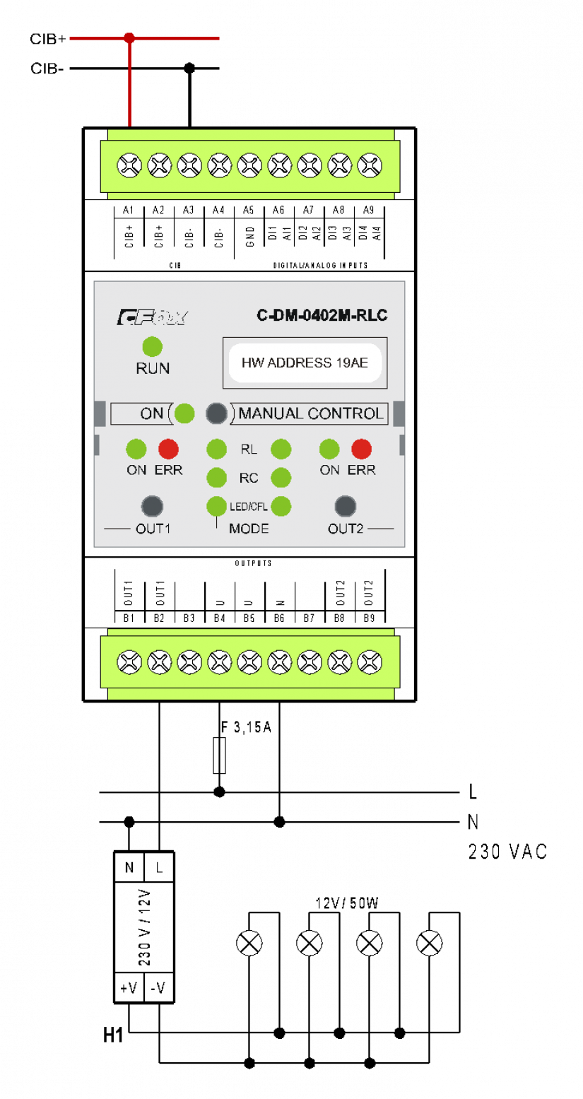 Pro stmívání NN žárovek napájených vinutými nebo elektronickými transformátory lze využít stmívací modul C-DM-0402M-RLC v provedení na DIN lištu. Umožňuje spínání a stmívání RLC zátěží (odporová, indukční a kapacitní zátěž) a stmívatelných kompaktních LED zdrojů a kompaktních zářivek.