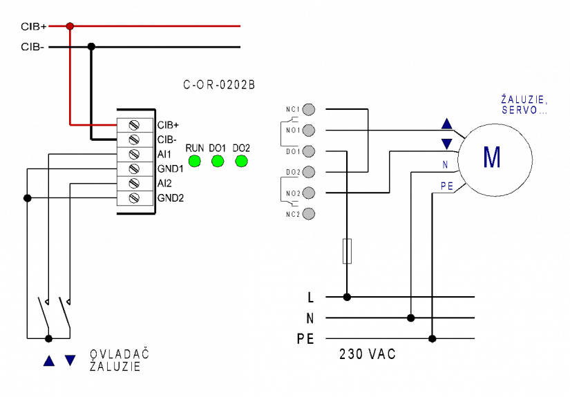 Obr.1    Příklad zapojení ovládání motoru žaluzií modulem C-OR-0202B