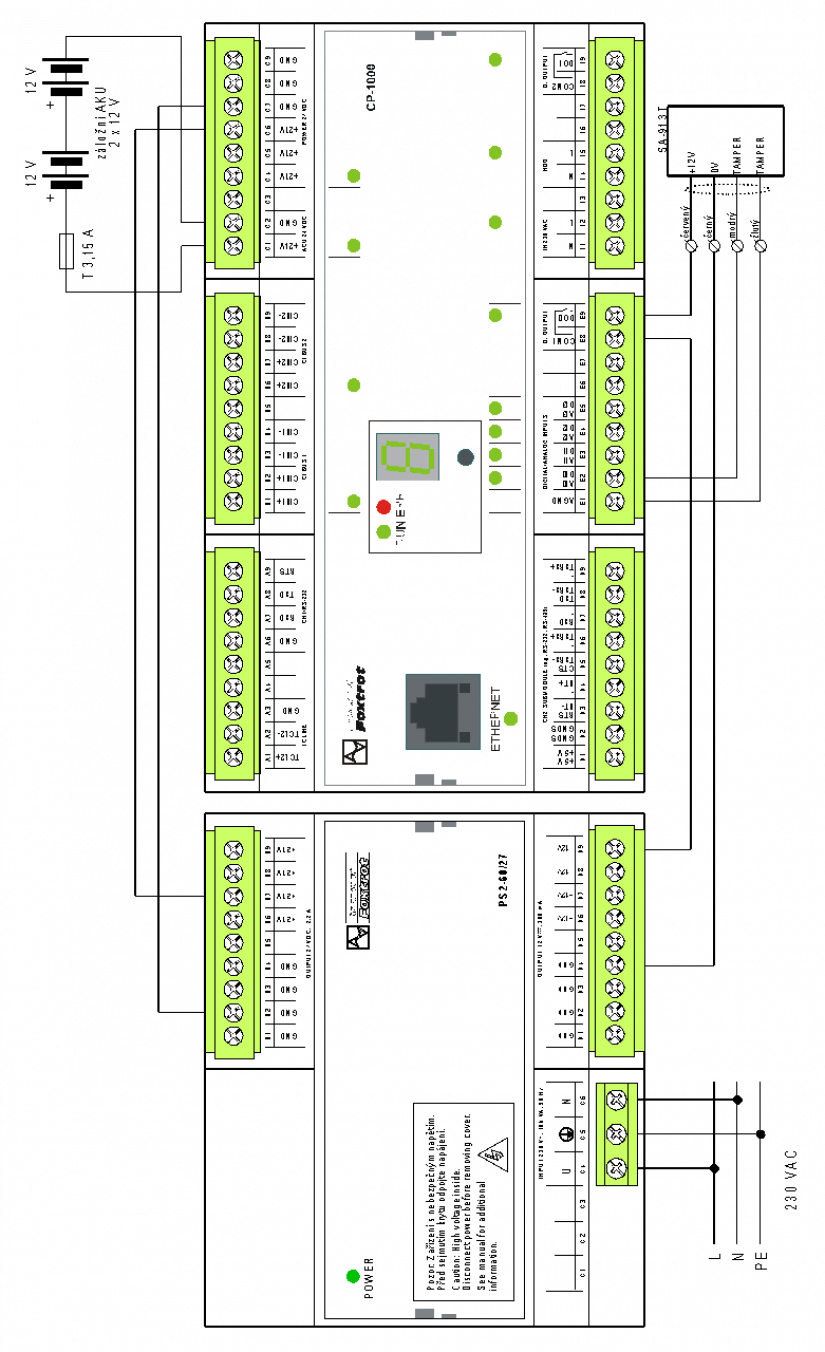 Následující příklad uvádí zapojení interní sirény SA-913 T k základnímu modulu CP-1000, se standardním napájením se zálohováním – zdroj PS2-60/27 a akumulátory 2x 12 V.