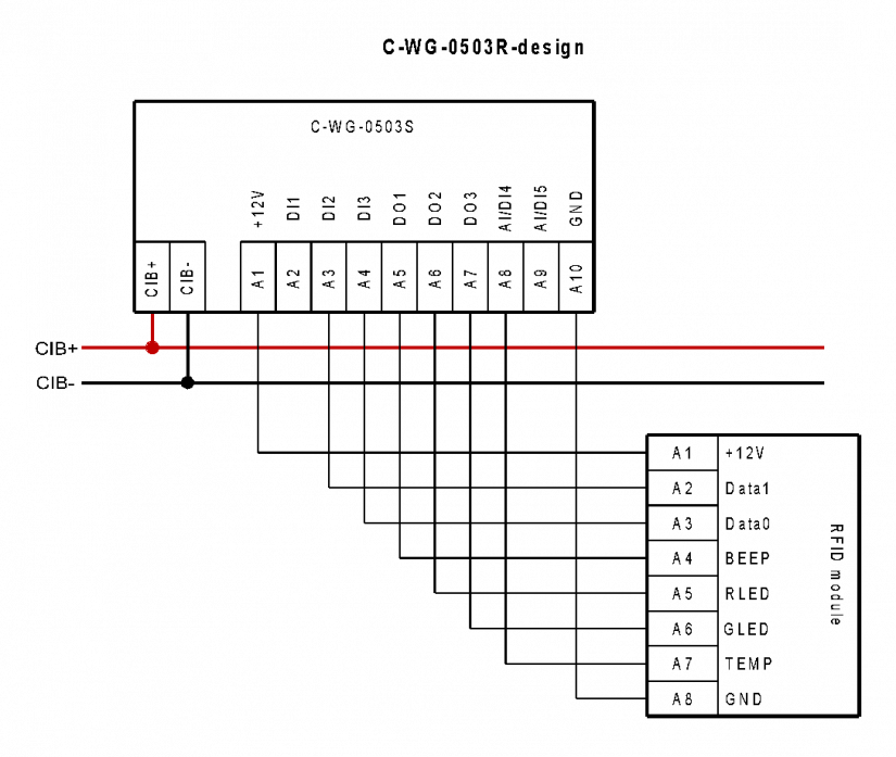 - Volný vstup AI/DI5 a AI/DI4 (jestliže není RFID modul osazen interním čidlem teploty, tak je volný i vstup AI/DI4) je možno použít např. pro připojení čidla teploty, nebo PIR detektoru apod. Pro napájení detektorů můžeme použít výstup +12 V modulu C-WG-0503S, k dispozici máme max. 25 mA (maximální odběr napájených detektorů).