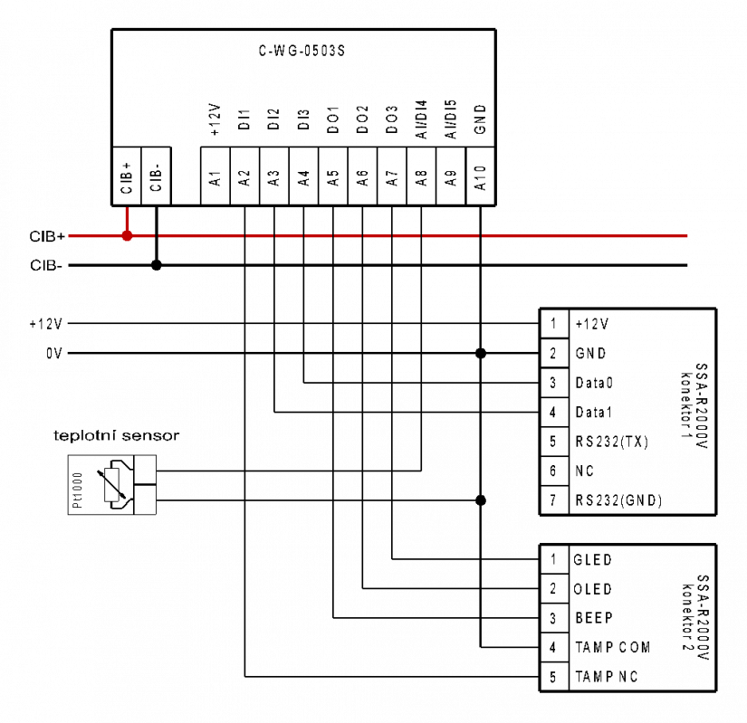 - Snímač SSA-R2000V má uvedený odběr z napájecího napětí 230 mA, což nevyhovuje specifikaci modulu C-WG-0503S (max. odběr z výstupu 12V je 60 mA) a snímač je nutno napájet z externího zdroje