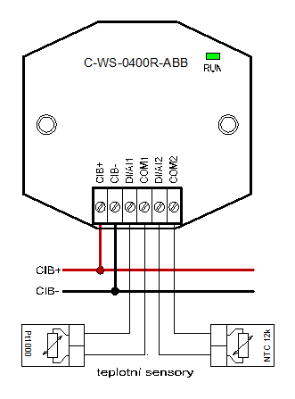 - Čidla teploty mohou být Pt1000, NI1000, NTC 12k nebo jiné NTC s odporem do 100k, délka přívodního kabelu může být až desítky metrů – typické použití podlahové čidlo, použitý kabel např. SYKFY a podobný kabel alespoň 1x2 vodiče průměru min. 0,5 mm.