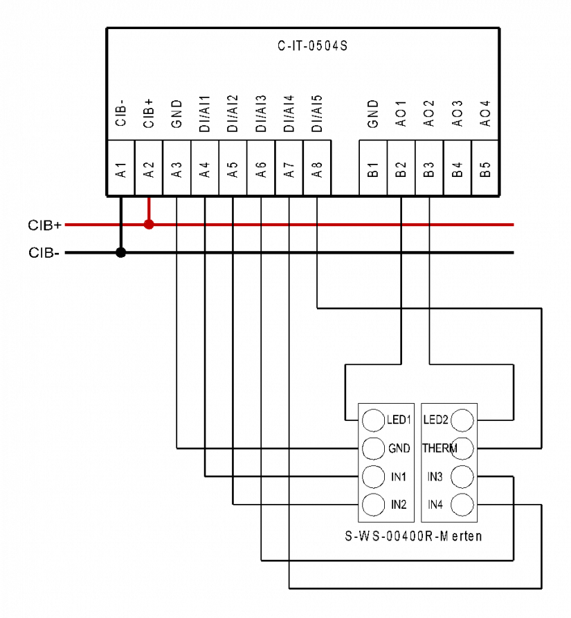 Obr. 1 Příklad připojení ovladače S-WS-0400R-Merten k modulu C-IT-0504S