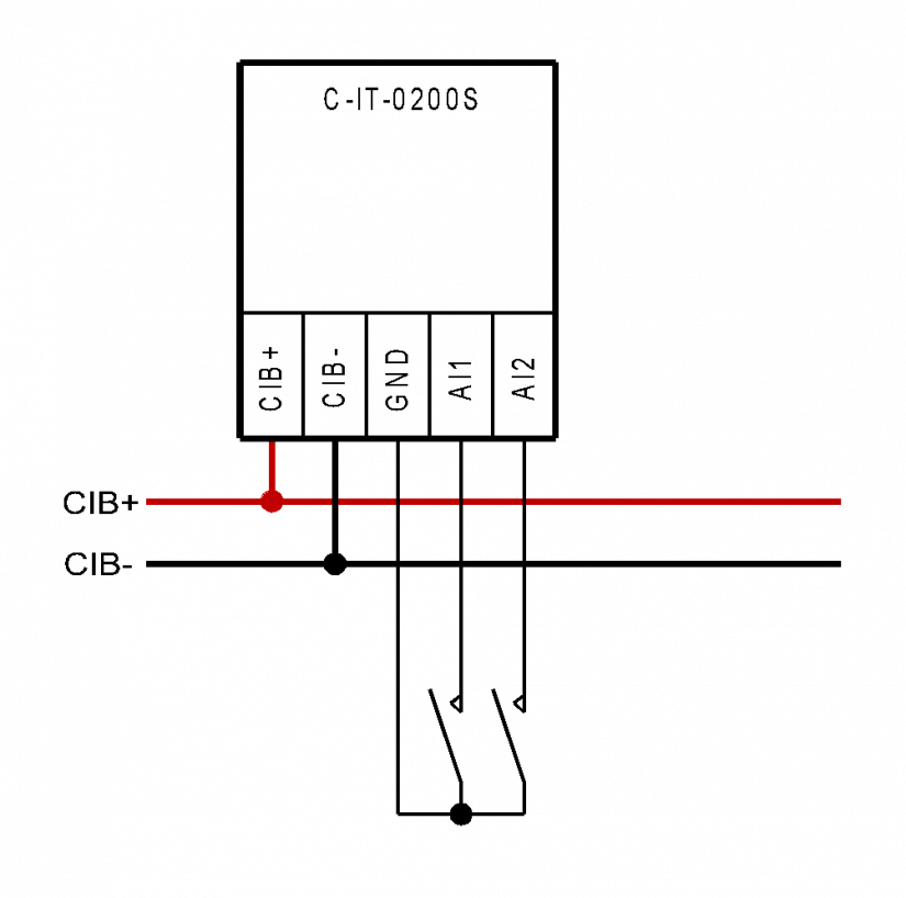 Obr. 1 Příklad zapojení dvou tlačítek snímaných modulem C-IT-0200S