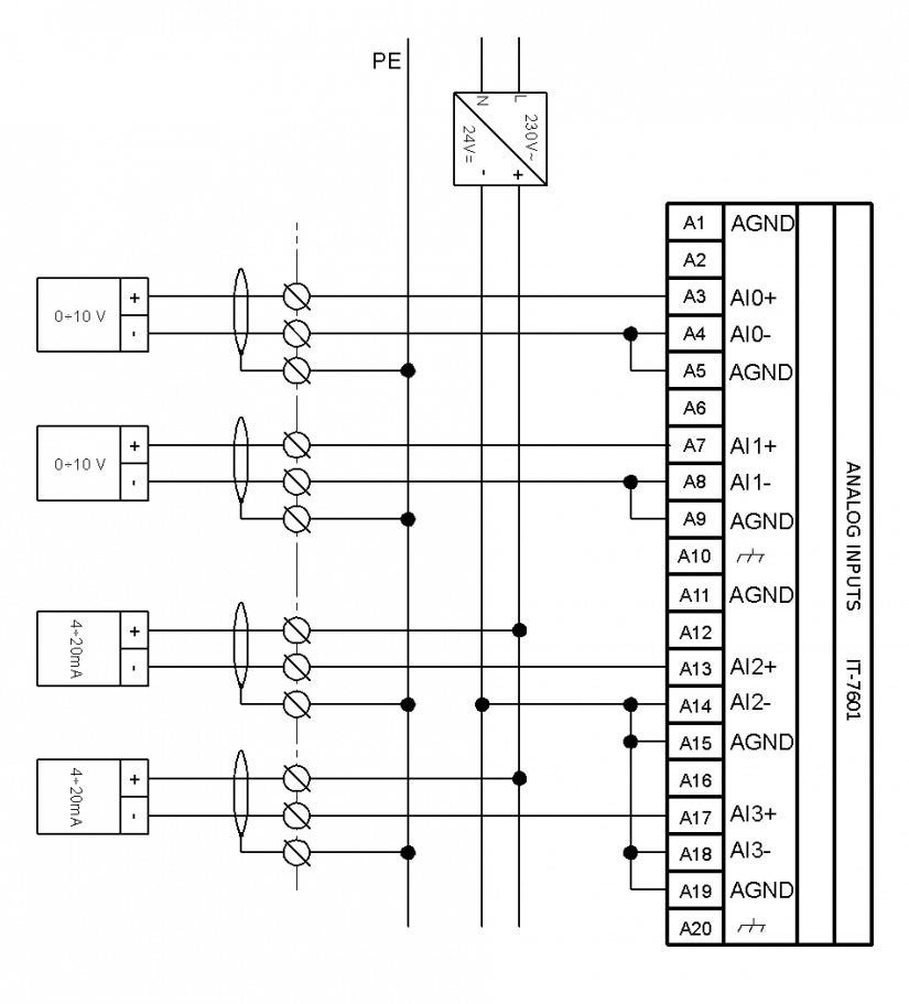 Analogový vstupní modul IT-7601 obsahuje 8 diferenciálních analogových vstupů určených pro měření standardních signálů (10 V, 20 mA atd.). Modul je galvanicky oddělen (všechny vstupy společně) od ostatních obvodů PLC. Každý vstup je nezávisle na ostatních programově nastavitelný.