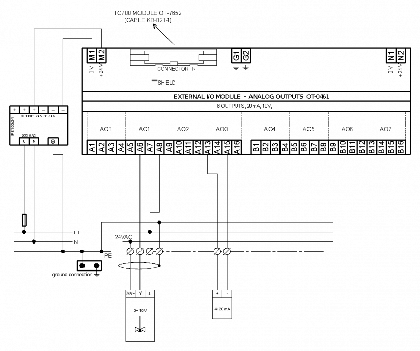 Externí modul OT-0461 je určený pro připojení až 8 standardních analogových výstupů 0 (4) až 20 mA nebo 10 V do řízené technologie a jejich převedení do modulu řídicího systému (připojení k modulu OT-7652 systému TC700). Modul je osazen svorkovnicí s pružinovými kontakty. Každý výstup 24 V DC pro napájení výstupních zařízení je chráněn tavnou pojistkou umístěnou na modulu. Napěťové výstupy jsou osazeny základní ochranou (transil), proudové výstupy jsou osazeny sériovým odporem 10R a transilem.