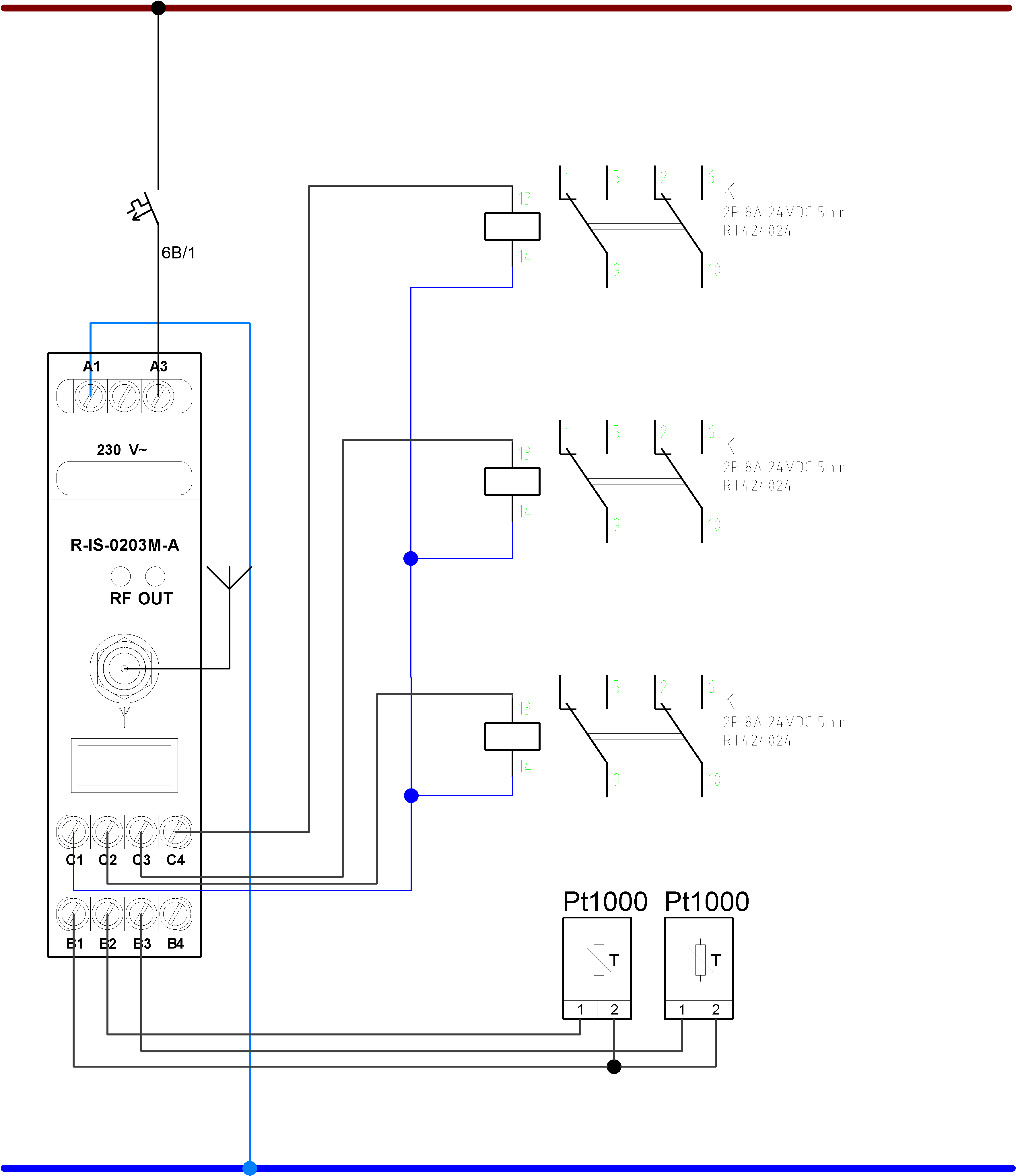 Obr. 1 Příklad spínání 3 relé RT výstupy modulu R-IS-0203M