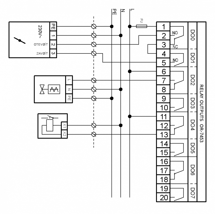 Přepínací kontakty je možné použít i jako rozpínací kontakty (DO4 v příkladu)