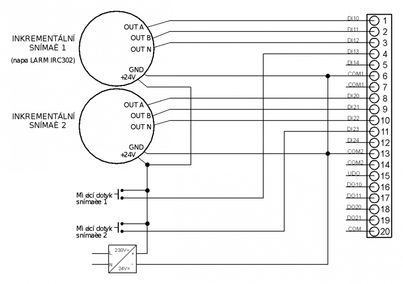 Na obrázku 8.5.3 je uvedeno základní použití v konfiguraci pro vyhodnocení dvou inkrementálních snímačů polohy. Zapojení předpokládá snímač napájený ze zdroje 24 V= s využitím externího napájecího zdroje 24 V. Výstupy snímače jsou otevřené kolektory PNP (spínače proti kladné svorce napájení +24 V). Kontakt měřicího dotyku je napájen ze zdroje 24 V= (jako standardní binární vstup PLC).