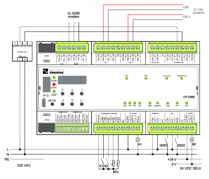 - Doporučujeme napájecí zdroj stabilizovaný 24 VDC, splňující podmínky SELV, standardně doporučujeme DR-60-24. Příkon CP-2000 je dán součtem příkonu vlastních obvodů centrály (typ. 5 W) a celkového příkonu všech modulů CFox připojených na obě větve CIB.