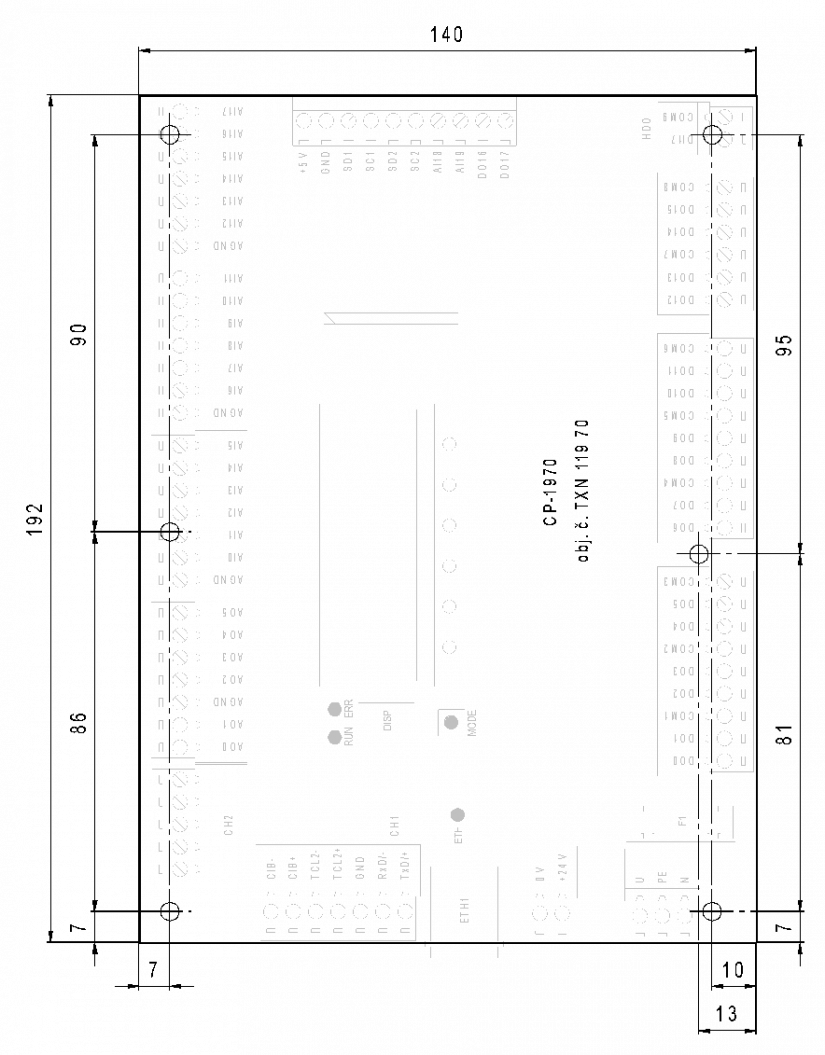 Obr. 2    Vnější rozměry modulu CP-2970 včetně umístění upevňovacích otvorů