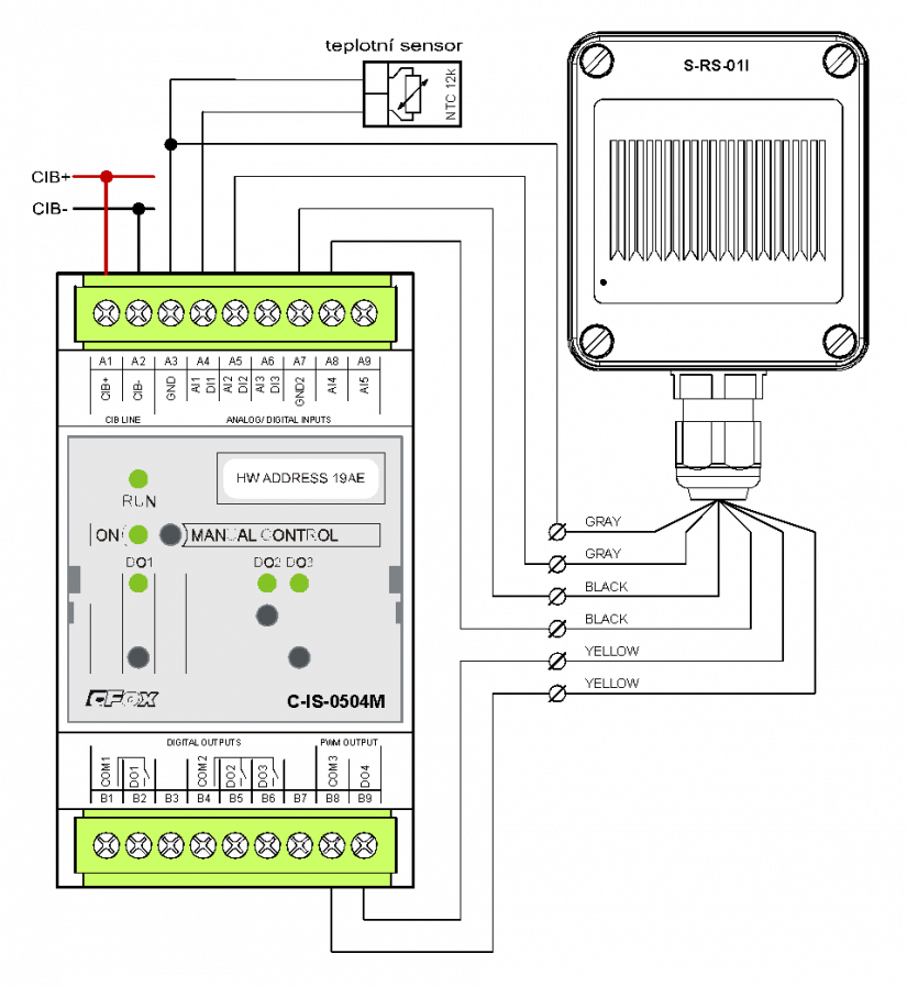 1. Délka kabelu mezi čidlem S-RS-01I a modulem C-IS-0504M může být až cca 20 m, stačí libovolný kabel, např. SYKFY, UTP apod., je potřeba zohlednit umístění kabelu ve venkovním prostředí