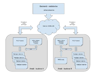 Obr 1. Blokové schéma nabíjecí infrastruktury ve dvou areálech, každý pod jedním přívodem ajedním