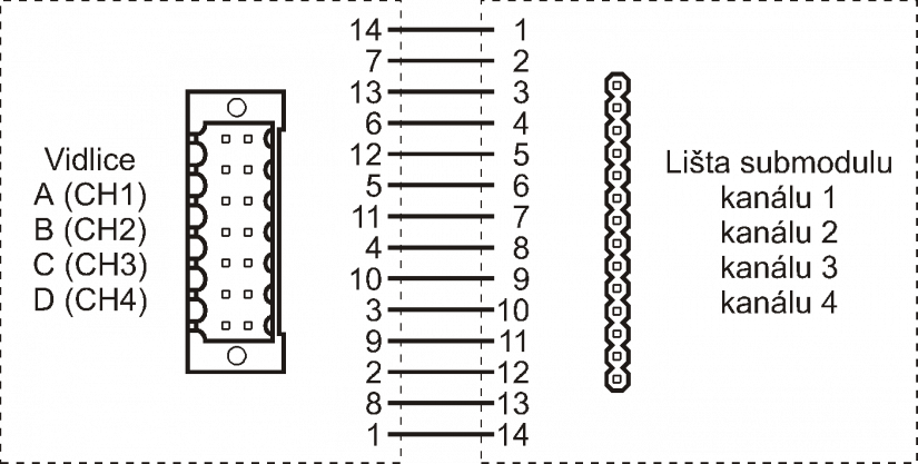 Obr. 3 Schéma propojení jednořadé kolíkové lišty pozice submodulu s výstupní vidlicí.