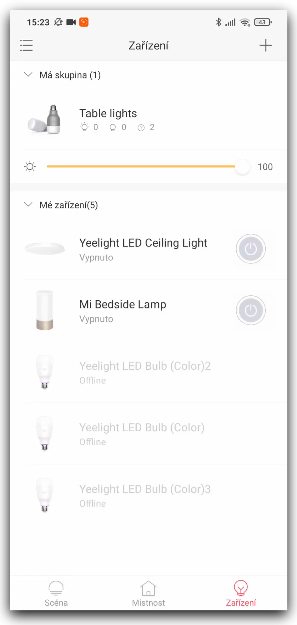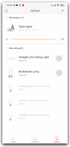 Pokud máme světla takto připravena, můžeme začít programovat v prostředí Mosaic. V příkladu budeme demonstrovat řízení jedné RGB žárovky (Yeelight RGB Smart Light Bulb) a jednoho stropního svítidla s funkcí ambientního osvětlení (Yeelight JIAOYUE 650).